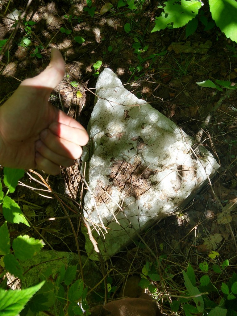 The second location was the jackpot: a major old mine that got filled with rock a few years ago, lest folks go in and hurt themselves. The upside is that the entire slope was absolutely filled with shiny gems (mostly quartz and calcite) of varying sizes. I filled up my prospecting bucket with some goodies and stumbled on a gigantic triangular quartz boulder just hiding in tall grass. (Pic #2 below.) The third pic shows random quartz rocks just chilling on a hill in their natural habitat. There is beauty in this world…