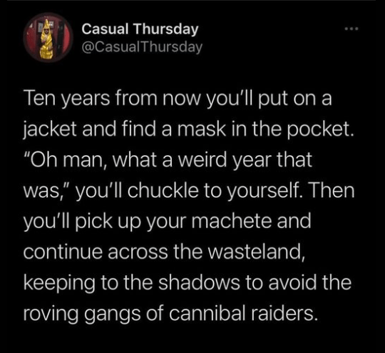 Trying to predict the future is nothing but hubris, but what the hell. I predict that a year from now, on December 31, 2021, things will be better. There will be enough vaccines, and enough distribution, to knock this fucker down and keep it from spreading like wildfire. There will be celebrations, and parties, and exuberant, heart-breaking and death-defying reveling as those of who us who will have made it through will try so very hard to catch up on this lost year. To forget it all.