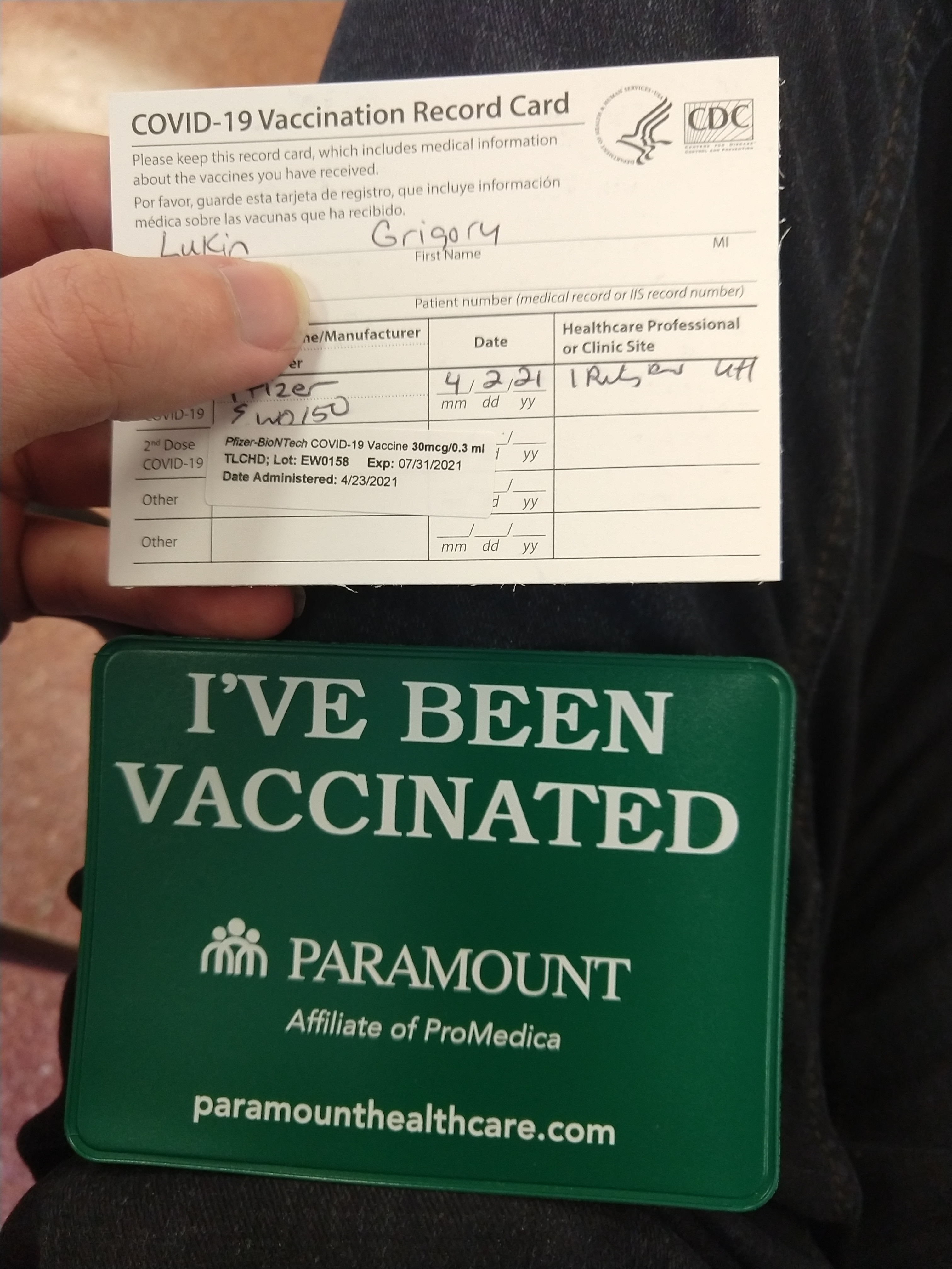 Test in hand, I made it to the Toledo health department, which was quite anticlimactic. There was no line this time: perhaps all those articles about the slowdown in vaccine sign-ups are true. I was too giddy to get my shot despite being almost two hours early, so I didn’t pay much attention, but there were about seven people spending their mandatory 15 minutes in the observation area. At a glance, they were between 35-70 years old. This time, there was no address verification – they didn’t even ask me for my ID, only for my date of birth, which they used to find my appointment in their database. (Minutes earlier, the security guard asked if I had an appointment or was a walk-in: are their vaccines really that abundant?..) A really cool medic in the adjoining room asked a few perfunctory questions, asked for my consent (I made sure to reply with an enthusiastic “Yes! Of course! Two thumbs up!” just in case), and gave me the second shot of the Pfizer-y goodness.